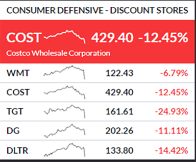 월마트와 타깃의 연쇄 실적 부진은 실적 발표도 없던 유통업계 전반으로 옮겨붙었습니다. 수요일 장중 회원제 유통업체 코스트코는 12.45%, 전자제품 전문 유통업체 베스트바이는 10.51% 하락하는 등 필수소비재, 임의소비재 섹터 할 것 없이 전부 하락했습니다. 저가 제품을 주로 다루는 달러트리, 달러제너럴 역시 각각 14.42%, 11.11% 하락하며 대부분의 유통업체가 10% 넘게 폭락했습니다.