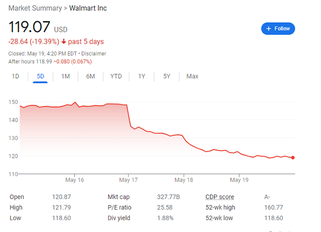 월마트 최근 5일간 주가(5월 19일 종가기준)
