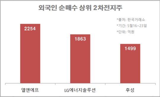 외국인이 사들이고 있는 업종은 주로 2차전지주다. 외국인은 이 기간 LG에너지솔루션을 1863억원 순매수 했고, 후성도 1499억원 사들였다. 이외 기아와 SK이노베이션도 각각 789억원, 446억원 순매수 했다.