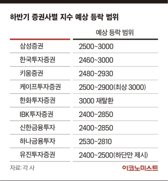 시장에서는 금리인상 이슈가 일단락된 만큼 하반기엔 반등세를 보일 것으로 에상한다. 하반기 코스피 예상 등락 범위를 발표한 증권사 중 삼성증권(2500~3000), 한국투자증권(2460~3000), 한화투자증권(3000 재탈환), 케이프투자증권(2500~2900‧최상 시나리오 3000) 등 4곳이 코스피 3000 회복 가능성을 전망했다.