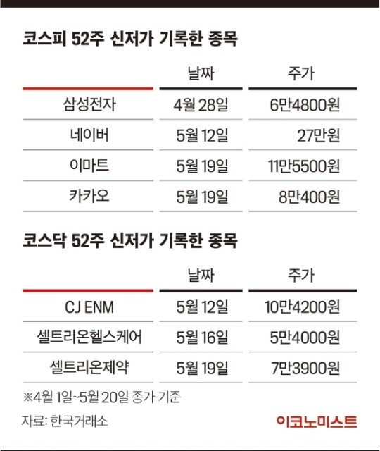 개미들의 사랑을 받은 삼성전자(6만4800원·4월 28일)와 국내 대표 성장주인 네이버(27만원·5월 12일)‧카카오(8만400원·5월 19일) 등 시가총액 상위 종목도 종가 기준 줄줄이 52주 신저가를 기록했다. 이마트도 지난 19일 신저가인 11만5500원에 거래를 마쳤다. 코스닥시장도 예외는 아니었다. 셀트리온헬스케어는 지난 16일 5만4000원, 셀트리온제약은 지난 19일 7만3900원으로 신저가를 경신했다.