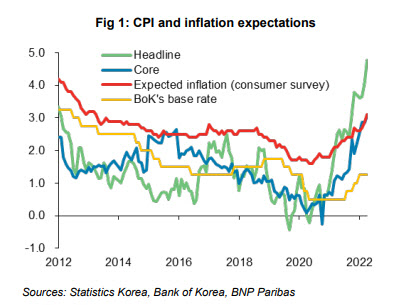 BNP파리바는 “한은은 올해 소비자물가 상승률 전망치를 종전 3.1%에서 4.5%로 대폭 상향 조정했을뿐만 아니라 내년 전망치도 2.0%에서 2.9%까지 크게 높여 높은 인플레이션이 더 지속될 것으로 보고 있다”며 “특히 2차 효과에 대해 우려하고 있으며 당분간 경제 성장 둔화보다는 인플레이션을 더 강조하는 통화정책을 시행할 것”이라고 평가했다.
