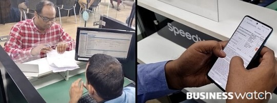 과거 삼성전자 인도 서비스 센터에서 서비스 내역을 종이문서로 제공하는 모습(왼쪽)과 현재 스마트폰에서 전자문서로 확인하는 모습(오른쪽) /사진=삼성전자 제공