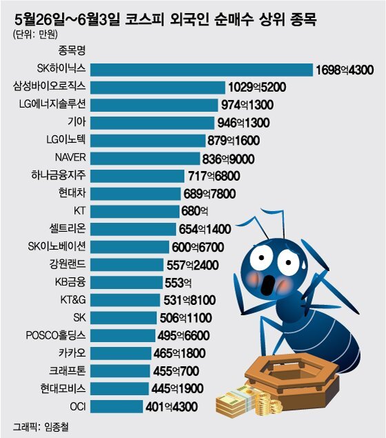 외국인이 5월26일 이후 코스피에서 가장 많이 산 종목은 10만원대로 하락한 SK하이닉스 (104,500원 ▼2,500 -2.34%)(1698억원)였다. 이어 삼성바이오로직스(1030억원), LG에너지솔루션 (435,500원 ▼2,000 -0.46%)(974억원), 기아 (83,000원 ▼500 -0.60%)(946억원), LG이노텍 (389,000원 ▲1,000 +0.26%)(879억원), NAVER (278,000원 ▼9,500 -3.30%)(837억원) 순으로 많이 샀다.