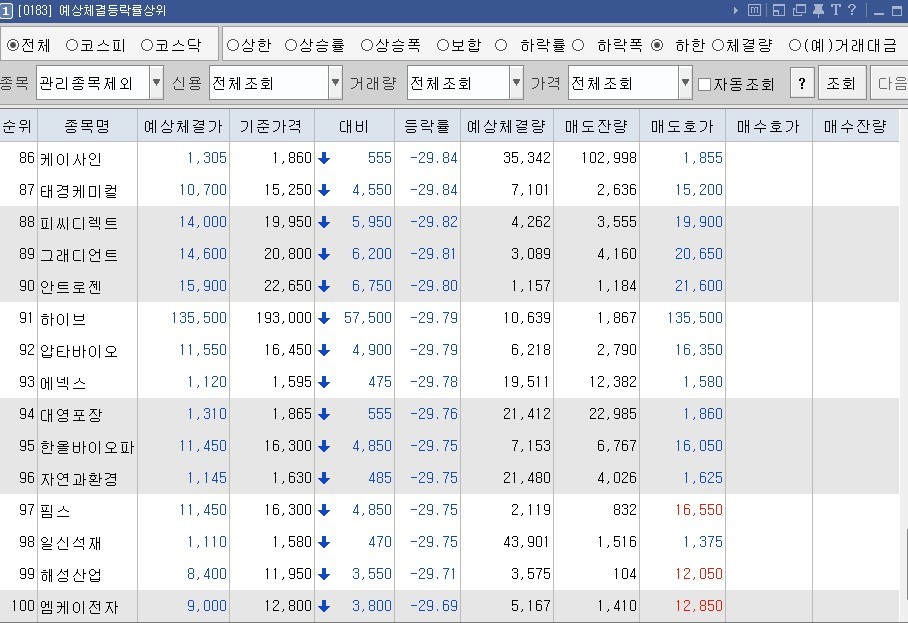 15일 금융투자업계에 따르면 이날 장 시작 전 동시호가가 시작되는 8시40분께 100개가 넘는 하한가 종목이 쏟아졌다. 하한가 종목이 무더기로 나온 것은 다양한 이유가 있지만, 전날 급락한 종목이 많았다는 점에서 증권사에서 강제로 미수 물량을 청산한 영향으로 풀이된다. 미수 청산 시 증권사는 하한가로 물량을 매도한다.