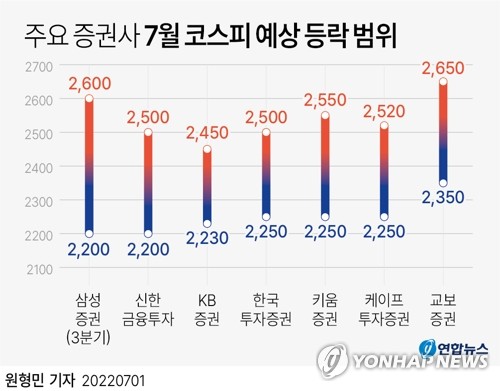 1일 금융투자업계에 따르면 증권사들의 7월 코스피 예상 등락 범위(밴드)는 신한금융투자 2,200∼2,500, KB증권 2,230∼2,450, 한국투자증권 2,250∼2,500, 키움증권 2,250∼2,550, 케이프투자증권 2,250∼2,520, 교보증권 2,350∼2,650 등이다.