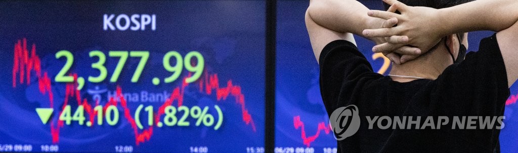 코스피는 작년 말 2,977.65에서 지난달 30일 2,332.64로 올해 상반기 21.66% 하락했다. 상반기 기준으로 1990년(-22.31%) 이후 32년 만에 최대 하락률이다.