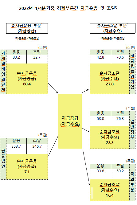방중권 한은 경제통계국 자금순환팀장은 “코로나19 지원금 등 가계 소득은 증가하는 가운데, 기준금리 인상과 가계대출 규제 등으로 주택투자 등이 둔화되면서 가계 순운용 규목 지난해 1분기 대비 큰 폭 증가했다“고 설명했다.
