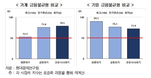 코로나19 위기의 기업 금융 불균형 정도는 71.9p를 기록해 외환위기(89.5p)나 금융위기(76.3p) 때보다는 낮은 수준이었다.