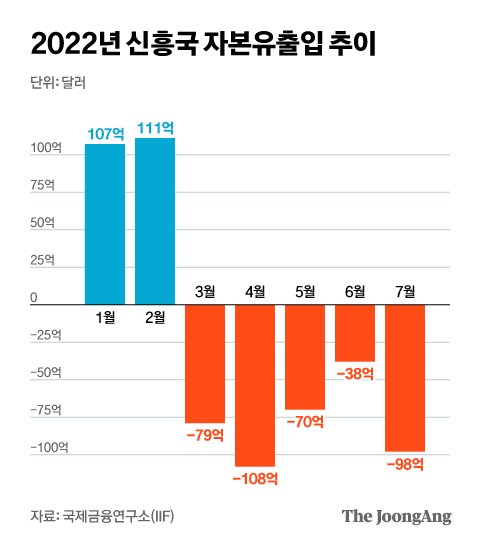 국제금융협회(IIF)는 최근 지난달 신흥국의 자본 순 유출 규모가 98억 달러(약 12조8000억원)라고 밝혔다. 지난 3월 이후 신흥국 시장에서 5개월 연속 자본 순 유출이 이어지고 있다. 2005년 통계를 처음 집계한 이후 최장 기간 자본 유출이다. 이 기간 빠져나간 외국 자본은 393억 달러(약 51조원)다.