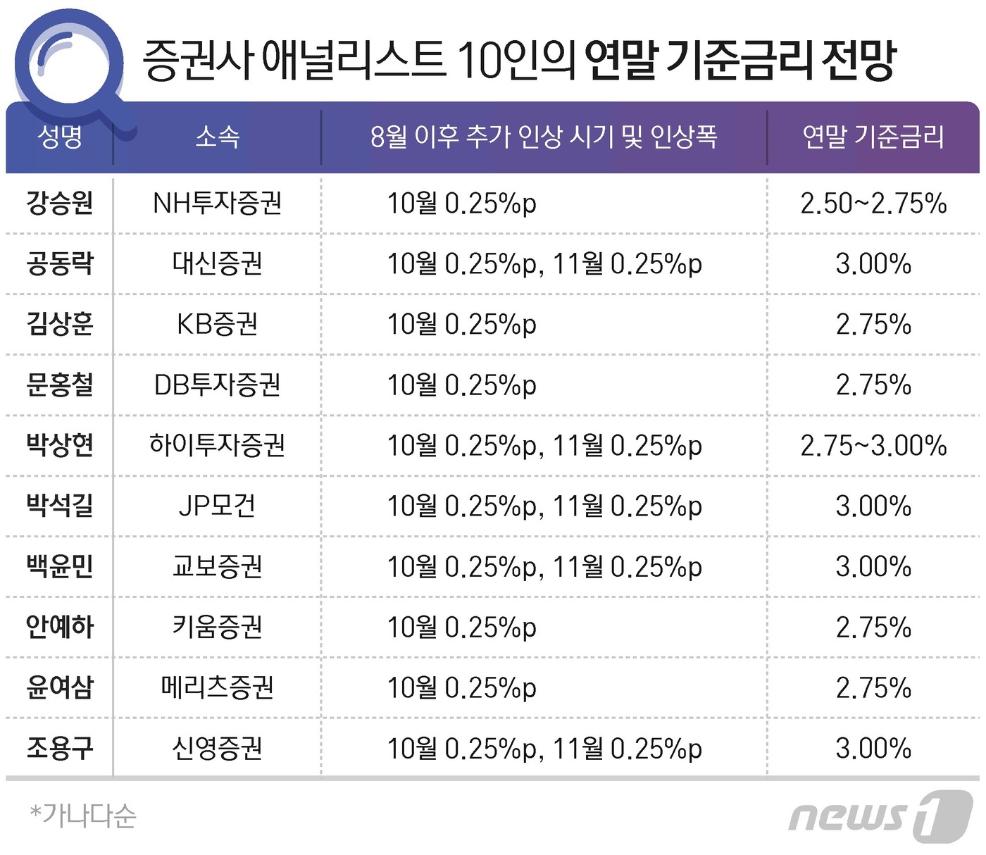 21일 <뉴스1>이 국내외 증권사 소속 전문가 10명을 대상으로 설문한 결과, 이들 가운데 4명은 기준금리가 올해 연말 기준금리로 3.00%를, 4명은 2.75%를 예상했다. 이밖에 1명은 2.75~3.00%, 1명은 2.50~2.75% 수준에 이를 것으로 내다봤다.
