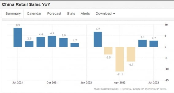 중국이 금리 인하에 나선 것은 경기가 예상보다 부진하기 때문입니다. 7월 소매판매가 예상치인 5%에 못미치는 2.7% 증가에 그쳤고 산업생산 증가율도 전달보다 내려갔습니다.