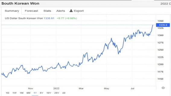 미국의 GDP 실시간 집계 시스템인 GDP나우는 미국의 3분기 성장률을 1.6%로 예상하고 있습니다. 10월말에 나오는 미국의 3분기 GDP가 플러스로 전환하면 미국이 1·2분기에 두 분기 연속 마이너스 성장을 했다는 사실을 까맣게 잊게될 지 모릅니다. 그러면 Fed는 인플레이션을 Fed 목표치인 2%로 떨어뜨리기 위해 긴축을 더 가속화할 수 있습니다. 그렇게 되면 달러 가치는 더 올라 원·달러 환율이 13년 만에 1400원대에 근접할 가능성도 배제할 수 없습니다.