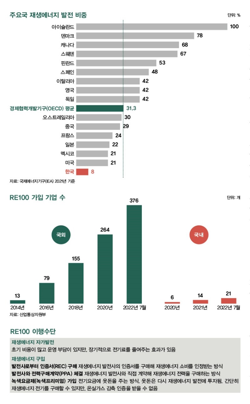 RE100을 달성하려면 기업의 사용 전력 전부를 온실가스를 배출하지 않는 재생에너지로 조달해야 한다. 직접 재생에너지 발전소를 짓거나, 재생에너지 발전사의 전력을 사면 된다. 전력 구매는 발전사의 공급인증서(REC)를 사거나 웃돈을 내는 녹색요금제에 가입하는 식으로 이뤄진다. 최근엔 발전사와 직접 계약하는 방식도 늘어나고 있다. 물론 인증서나 녹색요금, 발전사와의 계약 가격은 모두 해당 국가의 전체 재생에너지 발전량에 영향받는다. 한국은 이 세 가지 조달 방식에 드는 비용이 각각 유럽의 1.5~2배 수준인 것으로 알려졌다.