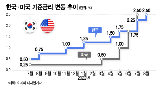 이날 한국은행 금융통화위원회(금통위)가 지난달 기준금리를 빅스텝(0.5%포인트)으로 인상한 데 이어 또다시 0.25% 포인트 인상을 결정했다. 여전히 높은 물가 수준과 환율을 고려한 것이다. 지난 7월 한국 소비자물가 상승률은 6.3%을 기록해 1998년 11월 이후 23여년 만에 가장 높은 수준을 기록했다.