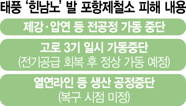 포스코그룹은 지난 7일 태풍 힌남노에 따른 공장 침수로 포스코 포항제철소 제강 및 압연 등 전 공정 생산을 중단한다고 공시했다. 생산 재개 일정은 적시하지 않았다.