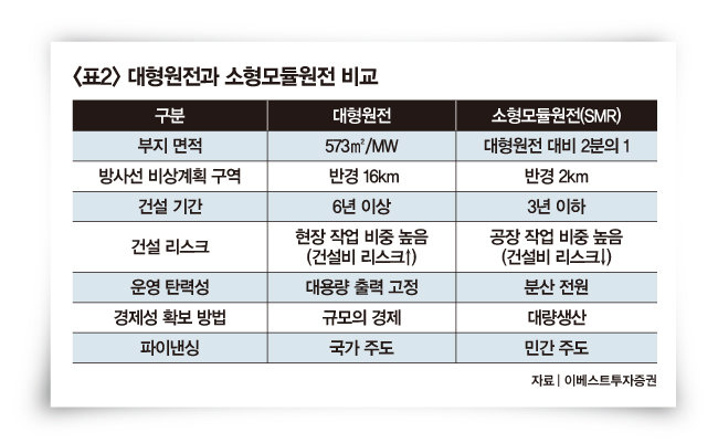 대형원전은 건설 과정에서 대규모 금융 조달이 요구된다. 현장에서 장기간 공사가 진행되는 탓에 일정이 지연되면 막대한 비용이 발생한다. 투자금을 회수하기 위해 원전 가동률을 높게 유지해야 하는 만큼 전력 수요에도 탄력적으로 대응할 수 없다. 반면 SMR는 공장에서 모듈을 생산하는 덕에 공기가 대형원전 대비 절반 가까이 줄어든다. 공기가 줄어들면서 발전 단가가 하락하고, 소형인 만큼 출력을 탄력적으로 조절할 수 있다. 백원필 한국원자력학회장은 "SMR는 출력 조절이 용이한 만큼 태양광과 풍력처럼 변동성이 큰 에너지 공급원에 대한 훌륭한 보완재가 될 수 있다"고 말했다.