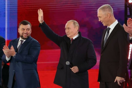 [모스크바=AP/뉴시스] 블라디미르 푸틴(가운데) 러시아 대통령이 지난달 30일(현지시간) 모스크바 붉은광장에서 열린 우크라이나 점령지 병합 기념행사에 참석해 데니스 푸실린(왼쪽) 도네츠크인민공화국(DPR) 수반, 블라디미르 살도 헤르손 지역 수반이 웃으며 바라보는 가운데 손을 흔들며 인사하고 있다. 2022.10.01.