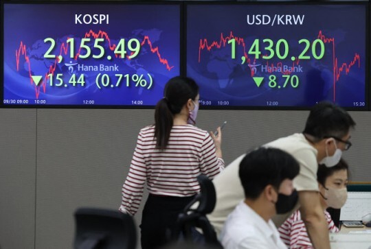 3일 마켓포인트에 따르면 지난주(9월 26~30일) 코스피는 전 주보다 134.51포인트(5.87%) 내리며 2155.49에 거래를 마쳤다. 같은 기간 미국의 스탠다드앤드푸어스(S&P)500지수가 2.91% 하락한 점을 감안하면 약 2배가량 급락했다.