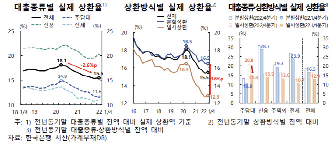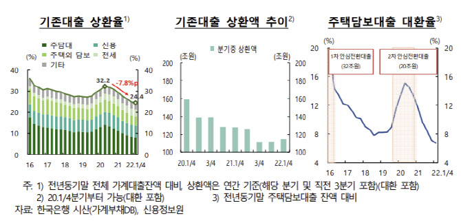 분기별 기존대출 상환액도 1분기 115조원으로 2020~2021년 평균(분기 130조원)을 큰 폭으로 하회한 것이다.