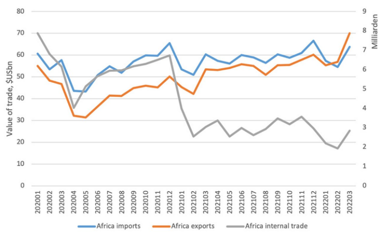 아프리카 무역의 가치, 2020년 1월-2022년 3월, US$bn