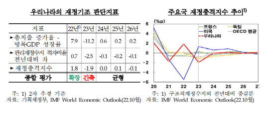 한편, 주요 선진국은 2021년부터 긴축 재정 기조로 전환했고 2024년 이후엔 균형 기조를 이어갈 것으로 예상된다. 특히 미국은 인플레이션 감축법(IRA) 시행 등으로 내년 이후소폭 확장적 재정 기조를 보일 전망이다.