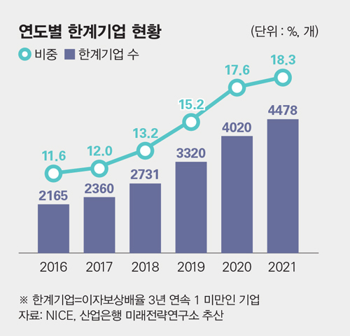 산업은행 KDB 미래전략연구소의 ‘한계기업 현황과 시사점 보고서’에 따르면, 지난해 말 한계기업은 4478곳으로 10년 전과 비교해 3125곳이나 폭증했다. 2011년 1353곳이었던 한계기업은 매해 꾸준히 증가했다. 특히 2016년 2165곳에서 2021년 4478곳으로 5년 만에 무려 106%나 급증했다. 같은 기간에 한계기업이 차지하는 비중도 11.6%에서 18.3%로 6.7%포인트 급등했다. 10년간 한계기업을 전전해온 기업도 120곳(0.49%)에 달했다. 5년 이상 한계기업 신세를 면치 못한 기업도 총 1762곳(7.19%)에 이른다.