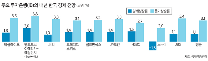 6일 국제금융센터에 따르면, 9개 주요 외국계 IB(바클레이즈·뱅크오브아메리카-메릴린치(BoA-ML)·시티·크레디트스위스·골드만삭스·JP모건·HSBC·노무라·UBS)가 지난달 말 기준 보고서를 통해 밝힌 내년 한국 성장률 전망치 평균은 1.1%로 집계됐다. 지난 10월 말 전망치 평균(1.4%)과 비교하면 한 달 사이에 0.3%포인트 하락했다.