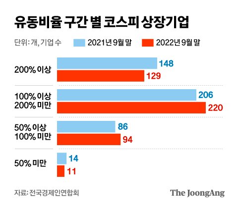 유정주 전국경제인연합회 기업정책팀장은 “유동비율이 100% 아래로 떨어지면, 단기 부채를 갚을 만큼 현금 유동성이 충분치 않다는 의미”라며 “고환율·고금리·고유가에 기업들이 직격탄을 맞고 있다”고 강조했다.