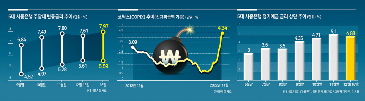 은행권 변동형 주택담보대출의 지표로 활용되는 코픽스(COFIX·자금조달비용지수)가 4%대를 넘어서며 사상 최고치를 다시 썼다. 이에 주요 시중은행의 주담대 금리는 연 8% 턱밑까지 치솟았다. 그러나 정작 정기예금 등 수신금리는 당국의 금리인상 자제령에 따라 줄어든 상태다. 나날이 늘어가는 금리 부담에 허덕이는 ‘영끌족’들의 울분이 터져나오고 있다.