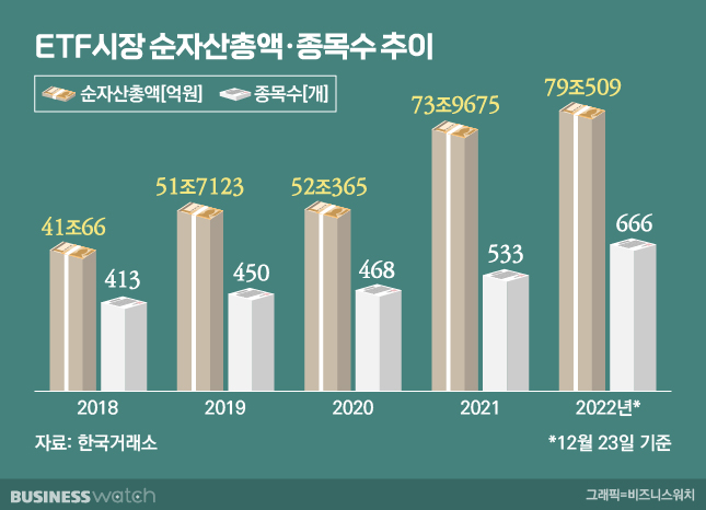 27일 한국거래소에 따르면 지난 23일 기준 ETF 시장 순자산총액은 79조509억원으로 전년말 대비 6.9% 증가했다.