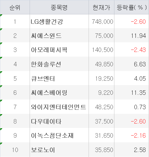 주식 투자 수익률 상위 1% 초고수들은 10일 오전 9시 30분 기준 LG생활건강, 씨에스윈드, 아모레퍼시픽, 한화솔루션 순서로 많이 순매수한 것으로 나타났다. 디앤씨미디어, 삼성전자우, 에스엠, 케이카 등은 순매도 상위 목록에 올랐다.