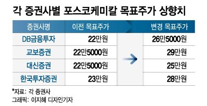 국내 증권사들은 포스코케미칼의 목표주가를 줄줄이 높였다. △DB금융투자 22만원→26만5000원 △교보증권 22만5000원→29만원 △대신증권 22만5000원→25만원 △한국투자증권 23만원→28만원 등이다.