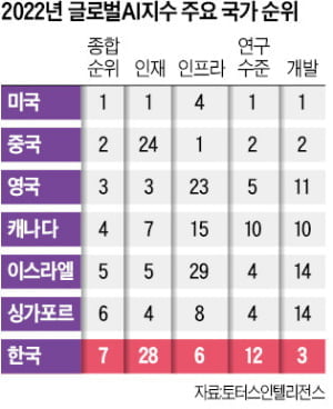 이스라엘은 지난해 영국 데이터 분석 미디어인 토터스인텔리전스의 ‘글로벌 AI지수’에서 한국을 2단계 앞지르고 종합순위 5위를 기록했다. 스타트업 강국 이스라엘엔 초거대 AI ‘쥐라기’를 개발하는 AI21랩스가 있다. 지난해 800억원 규모 시리즈B 투자유치를 완료하며 오픈AI의 경쟁사로 우뚝 선 곳이다. 정부 투자도 이어지고 있다. 이스라엘은 고등교육위원회 기획예산위원회, 이스라엘혁신청, 재무부 등이 모인 조직 ‘텔렘’을 통해 5년간 16억달러(2조원)를 쏟기로 했다. 목표는 인적 자본 확충과 컴퓨팅 인프라 마련이다.
