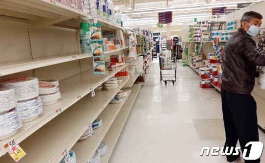 (서울=뉴스1) = 미국의 ‘코로나19’ 환자가 22일(현지시간) 3만 명을 돌파하는 등 급속도로 늘고 있는 가운데 미국은 감염자가 가장 많이 나온 뉴욕주 전체를 ‘중대 재난지역’으로 선포했다. 22일 미국의 대형마트 중 하나인 ‘코스트코’ 진열대가 텅 비어 있다. (쿠키뉴스 제공) 2020.3.23/뉴스1