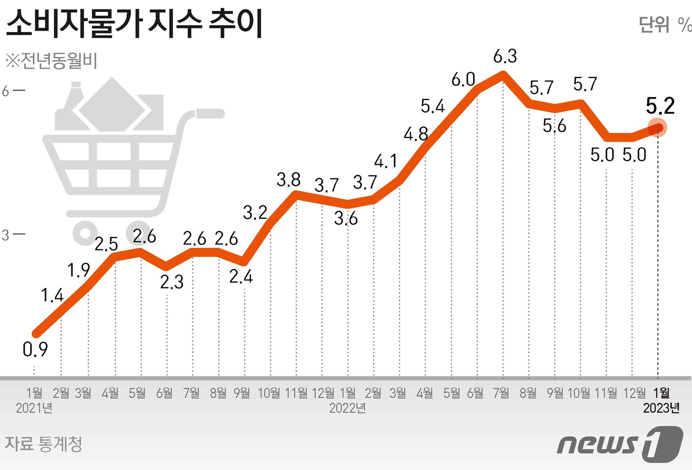 한은은 소비자물가가 이달 5%대 전후 상승률을 보이다 3월부터 4%대로 내리고 연말에는 3%대 후반으로 낮아진다고 보고 있다.