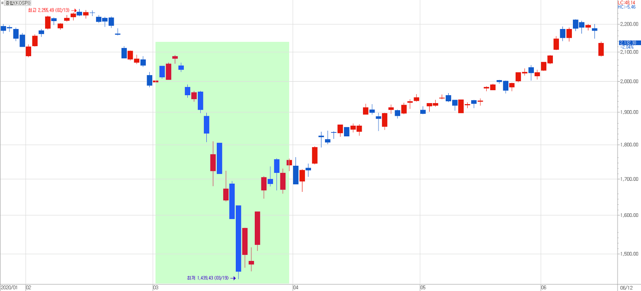 그 절정은 2020년 3월 19일 이었지요. 장중 코스피 지수는 –9.5%나 하락하였으니 거의 대부분의 종목들이 실질적인 하한가에 이르렀다고 해도 과언이 아니었습니다.