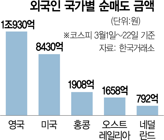 국가별로도 단기 투자자 성격의 외국인뿐 아니라 비교적 장기 투자자로 분류되는 국가의 투자자도 엑소더스가 이어지고 있다. 코스피 기준으로 영국 투자자들이 1조 930억 원을 순매도해 가장 많은 금액을 팔고 나갔다. 영국은 코스닥에서도 2950억 원 순매도로 1위였다. 영국은 단기성 투자금으로 분류된다. 국내 증시에서 2차전지나 로봇 등 연초 급등한 종목에 대한 투자금 회수로 분석된다.