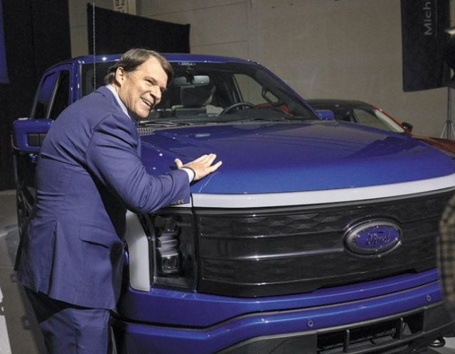 짐 팔리 포드 최고경영자(CEO)가 인기 전기 픽업트럭 ‘F-150 라이트닝’을 만지고 있다. AFP연합뉴스