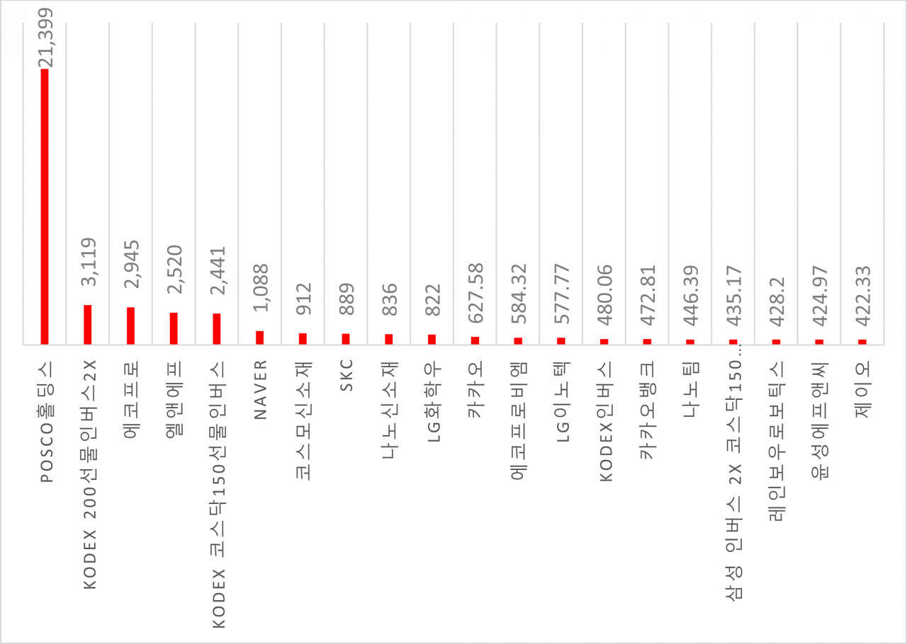 이차전지 관련 종목에 투자하면서도 리스크 헤지차원에서 인버스ETF를 투자하였을 수도 있지만, 일반적으로 네이키드로 한 방향으로 베팅하는 개인의 투자 성향을 고려 해 본다면, 특정 개인투자자 그룹은 이차전지 관련 종목 상승을 베팅하고 있고 어떤 개인투자자 그룹은 증시 급락을 기대하는 것처럼 보입니다.