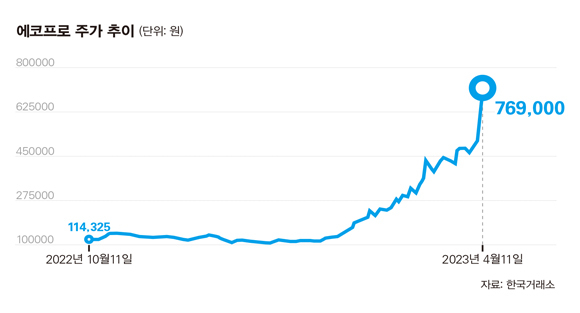 이들 회사는 '에코프로 3형제'로 불리며, 주식시장에서 기록적인 상승세를 이어가는 중이다. 4월19일 기준 에코프로 주가는 63만원에 거래를 마쳤지만, 14일 장 중 82만원까지 급등하면서 최고가를 경신했다. 지난 1월말까지 11만원대에 불과했던 주가가 불과 2개월 만에 7배 가까이 폭등한 것이다. 같은 기간 에코프로비엠 주가 상승률도 521%에 달한다. 코스닥지수는 올해 들어 30% 가까이 오르며 전 세계 증시를 통틀어 가장 높은 것으로 집계됐는데, 에코프로그룹이 코스닥 시장의 상승세를 이끌었다고 해도 과언이 아니다.