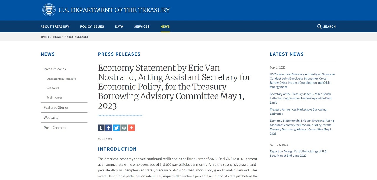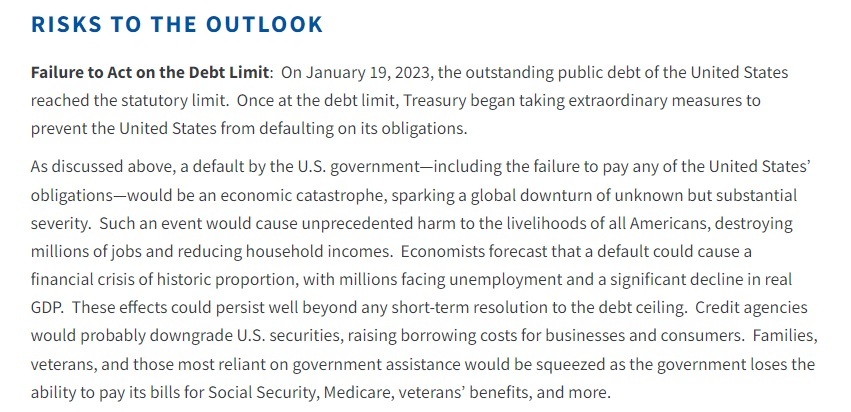 Economy statement 에서 옐런 장관은 부채 한도 협상을 촉구하면서