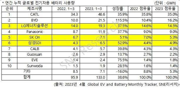 LG에너지솔루션의 배터리 사용량은 19.3GWh로 작년 동기보다 37.5% 증가했지만, 시장점유율은 14.5%로 작년 동기보다 0.1%포인트 하락했다. 점유율 순위도 2위에서 3위로 밀려났다.