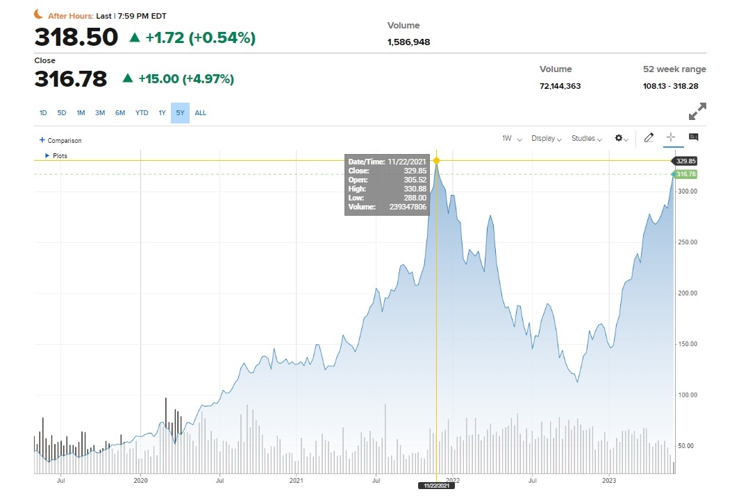 21년 고점 넘길 준비 중 입니다. 종목 리포트 보면 AI 그 자체로 볼 수 있습니다. 그리고 AI를 Gold Rush 로 표현하고 있는데, 그럴 듯 해 보입니다. 그러면서 반도체 업종을 끌고 가고 그것이 나스닥 상대적 강세의 요인 중 핵심으로 보입니다.