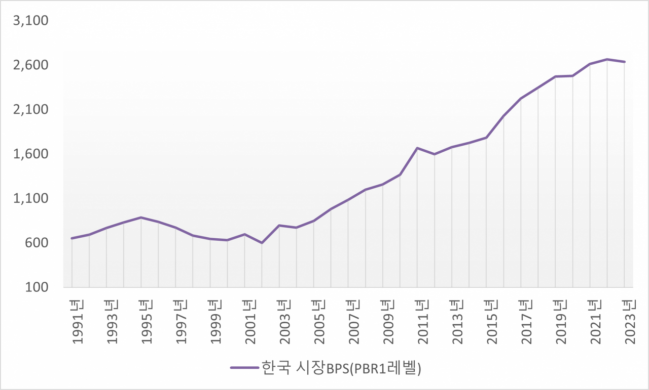 위의 자료는 1991년 이후 한국 코스피 시장의 PBR 1x 레벨을 필자가 계산하여 만든 도표입니다. 중간에 IMF 사태 때와 같은 부침은 있더라도 꾸준히 우상향해 왔음을 확인할 수 있습니다. 1991년에 650p에 있었던 코스피 PBR 1x 레벨은 2003년에 795p, 2013년에 1,676p, 2023년 최근에는 현재 2,600p 대에 들어와 있습니다.