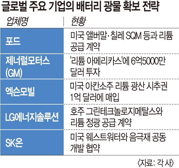 전기차 시장에서 경쟁이 격화하면서 배터리 핵심 광물을 둘러싼 ‘공급망 전쟁’이 거세지고 있다. 광물을 직접적으로 필요로 하는 배터리 셀·소재 기업은 물론 완성차 업체부터 에너지 기업까지 광물 확보전에 뛰어들었다.