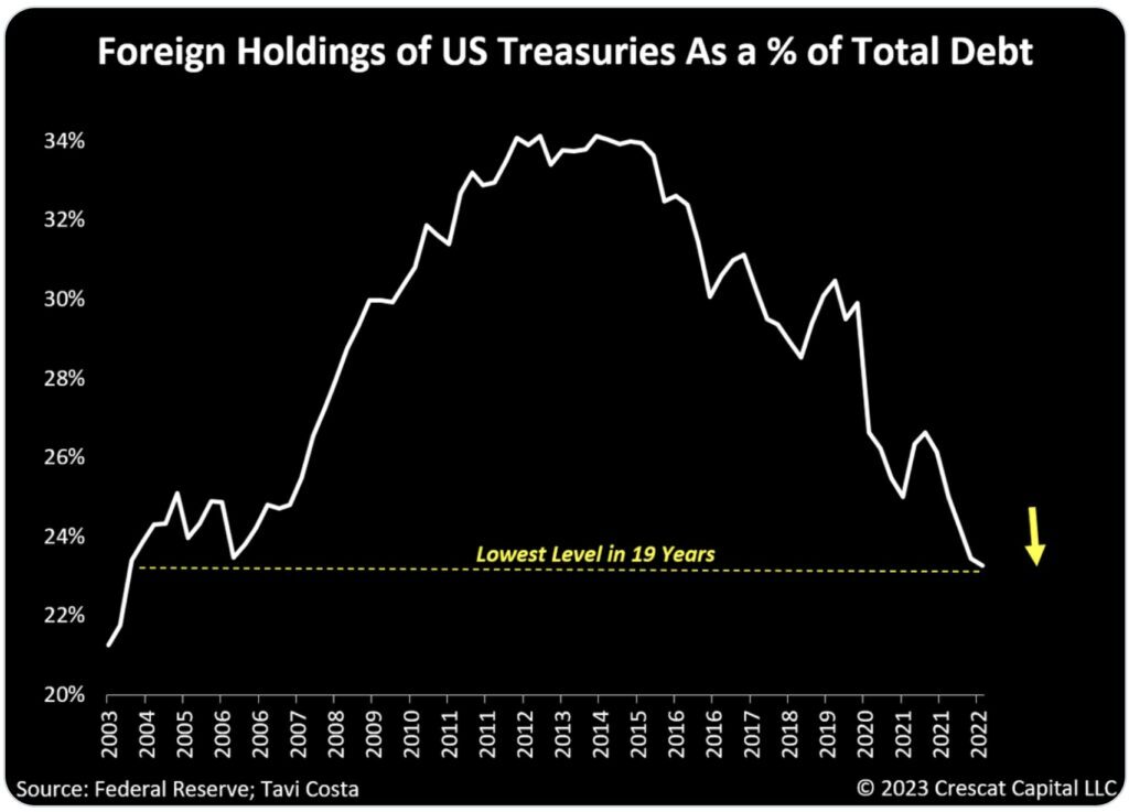 Otavio Costa: 외국인의 미국 국채 보유량이 19년 만에 최저 수준에 도달했다. 이러한 우려는 국채 구매자의 가용성이 감소함에 따라 더욱 증폭되었다. 시장 참여자들은 이번에 진정한 위험은 부채 한도 합의에 도달하지 못하는 것이 아니라 부채 문제의 확대되고 우려되는 성격에 있다는 것을 인식하기 시작했다.