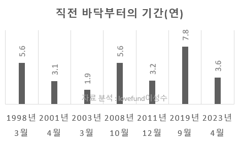 [ OECD경기선행지수의 저점과 저점사이의 기간,이번 사이클은 직전에 비해 매우 짧아졌다 ]