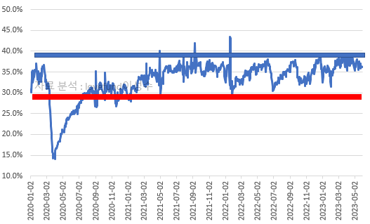 이 자료는 증시 토크를 통해 종종 언급해 드렸기 때문에 애독자님들께는 친숙한 지표라 생각됩니다. 이 지표가 40% 선을 넘거나 근접한다면 주식시장이 수급 측면에서 부담스럽다 할 수 있고, 반대로 30% 수준에서는 안심, 20% 선까지 내려가면 큰 기회의 시기로 해석 해 볼 수 있습니다.