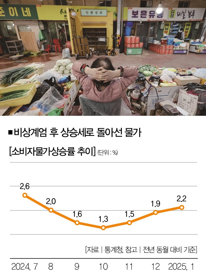 12·3 비상계엄이 끌어올린 환율은 안정세를 보이던 소비자물가지수도 오름세로 돌려놨다. 통계청이 발표한 1월 소비자물가 상승률은 전년 동월 대비 2.2% 상승했다. 2024년 8월 2.0% 이후 최고치다. 9월부터 1%대를 이어갔던 소비물가 상승률은 5개월 만에 2%대로 올라섰다.